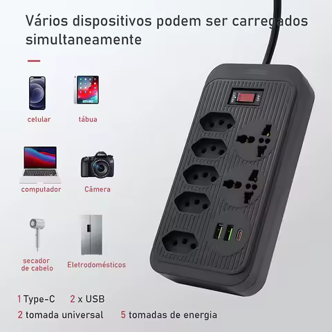Filtro de linha multitoque com USB tipo C, Plugue brasileiro, Cabo de extensão de tomada, Carregador de plugue USB