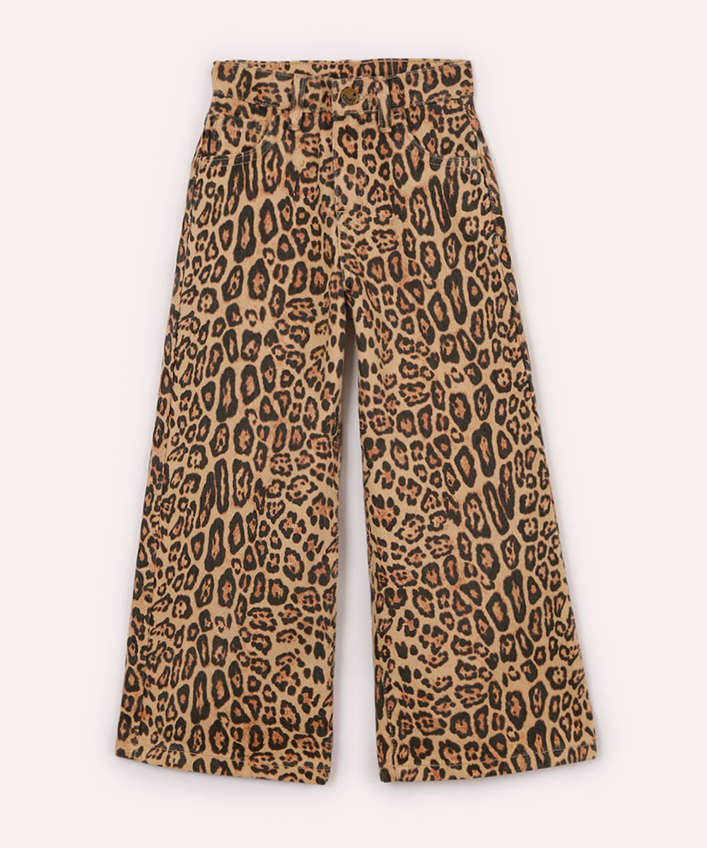 calça wide leg infantil animal print bege