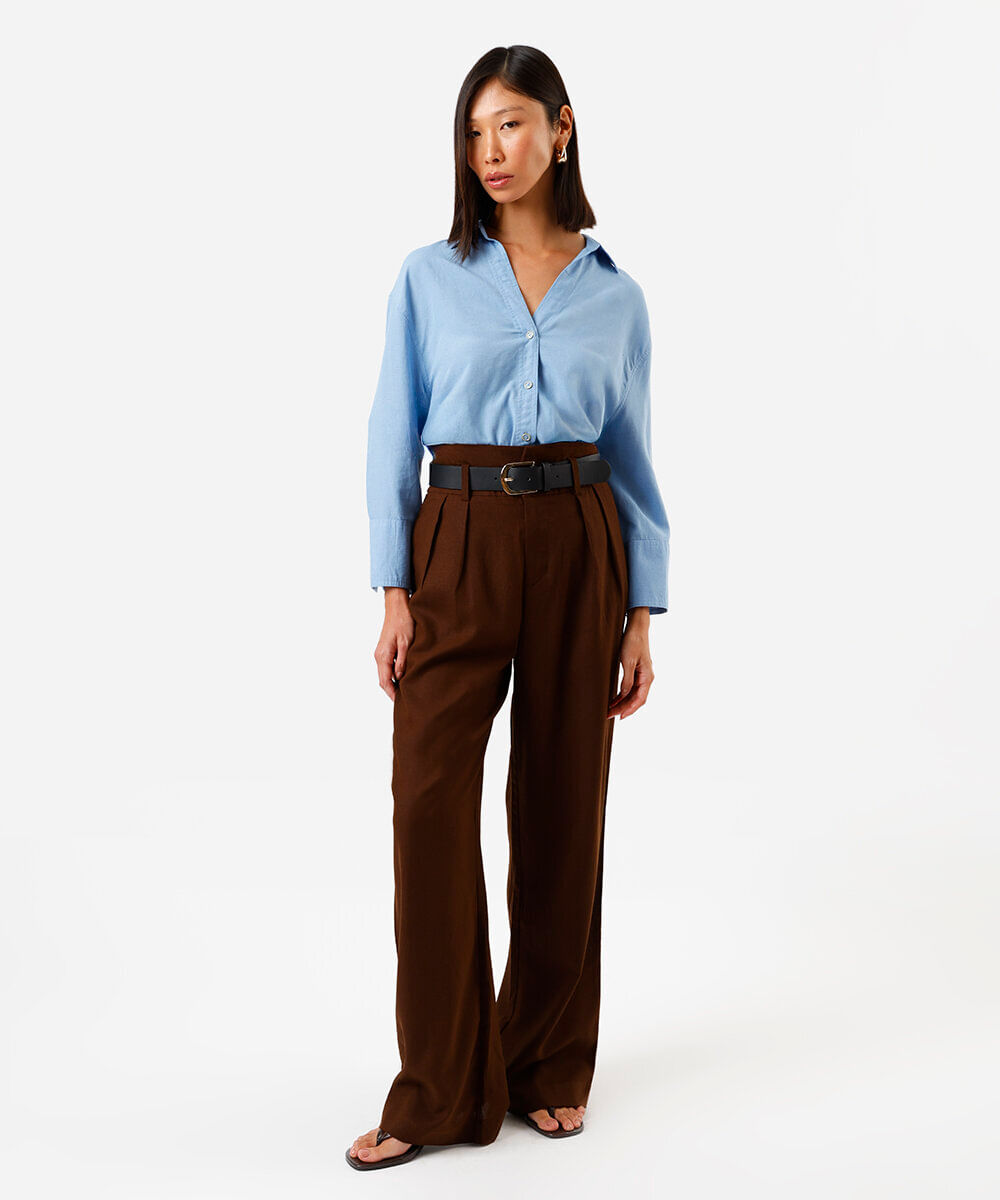 calça reta feminina com linho e cinto marrom