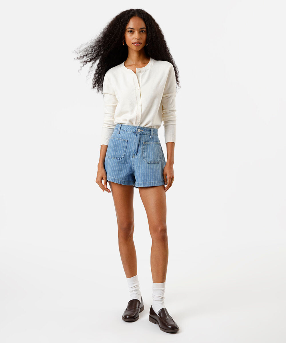 short feminino jeans listrado azul