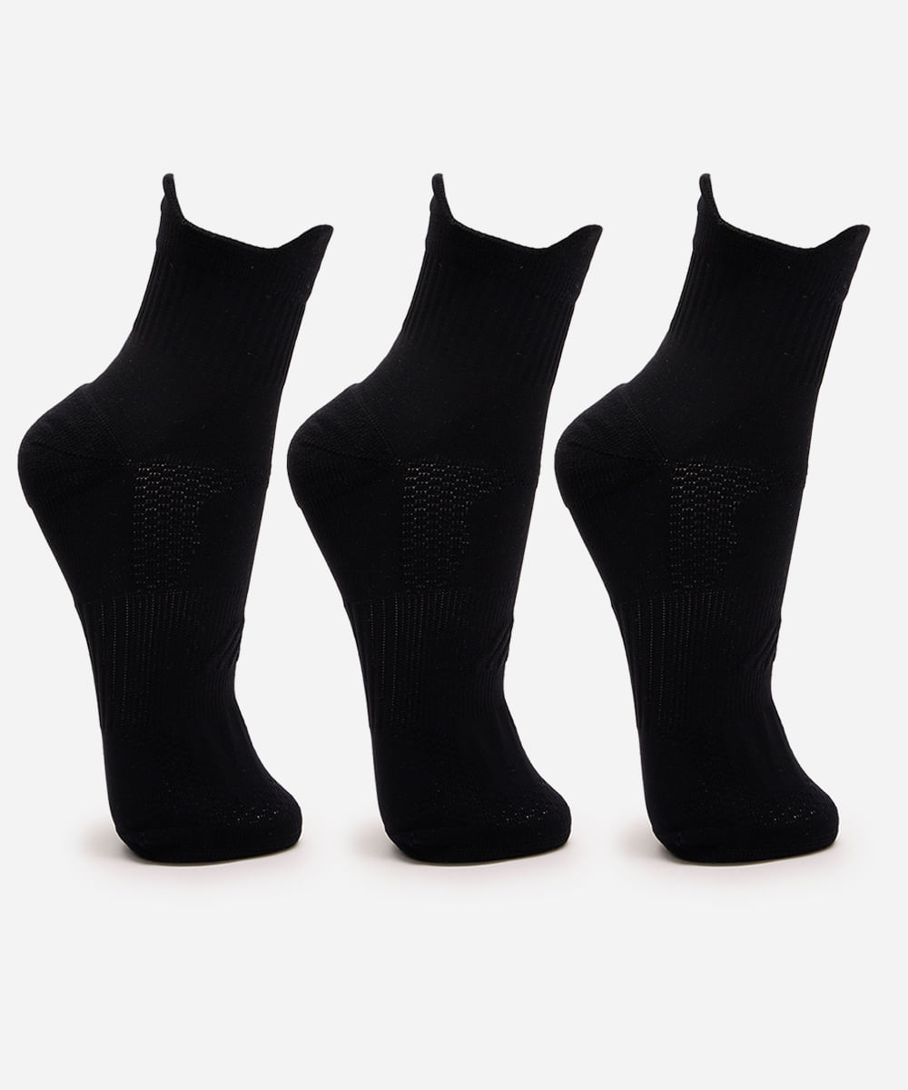 kit de 3 meias cano médio de poliamida caneladas preto