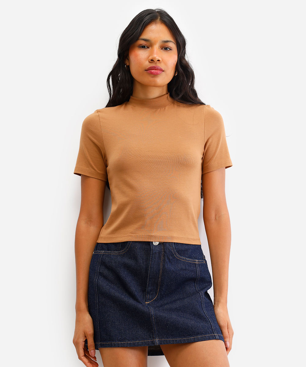 cropped de algodão gola rolê manga curta marrom
