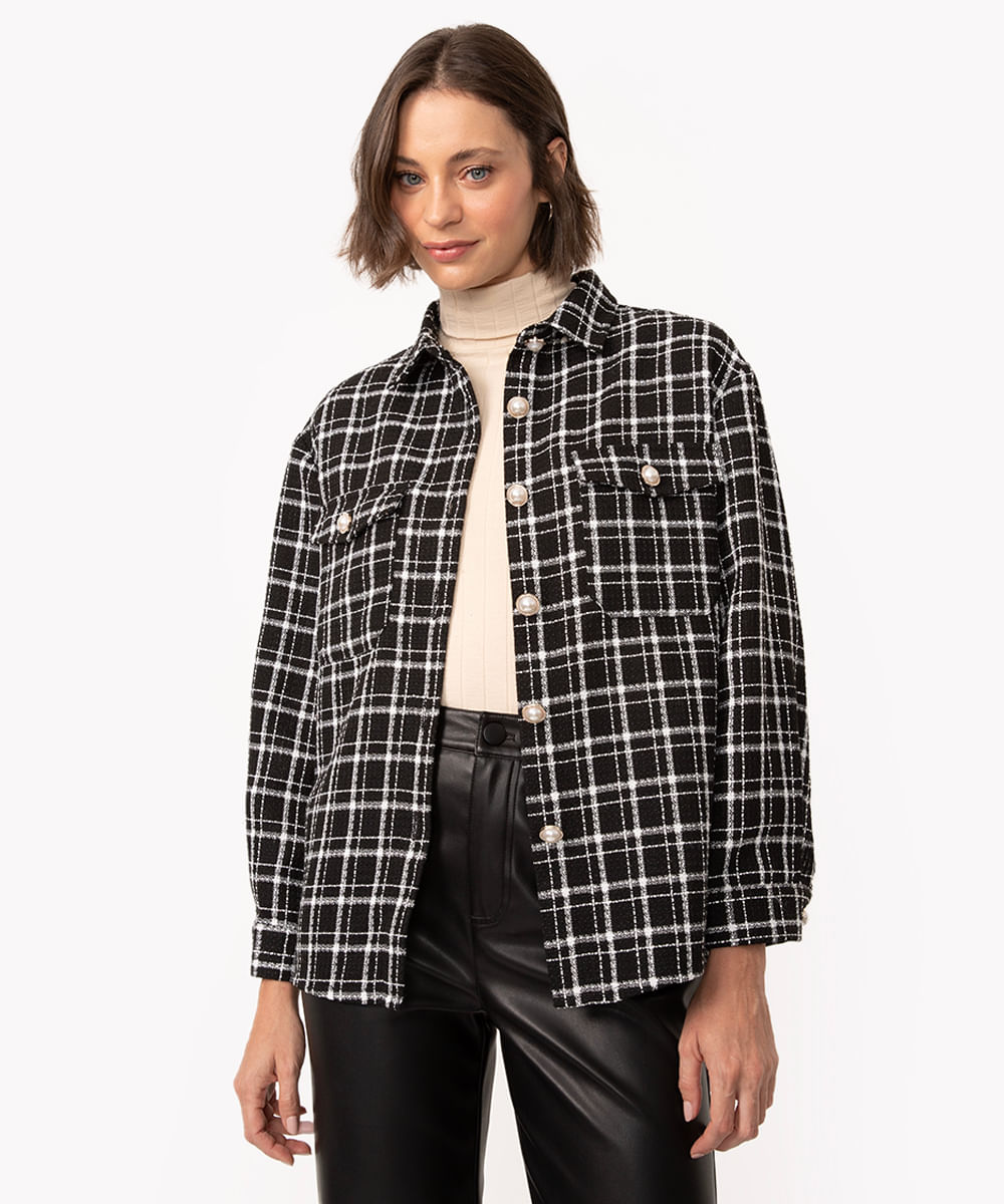 jaqueta shacket tweed com bolso preto