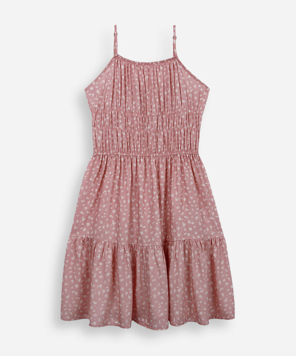 vestido curto alça fina juvenil de viscose com recorte floral rosa
