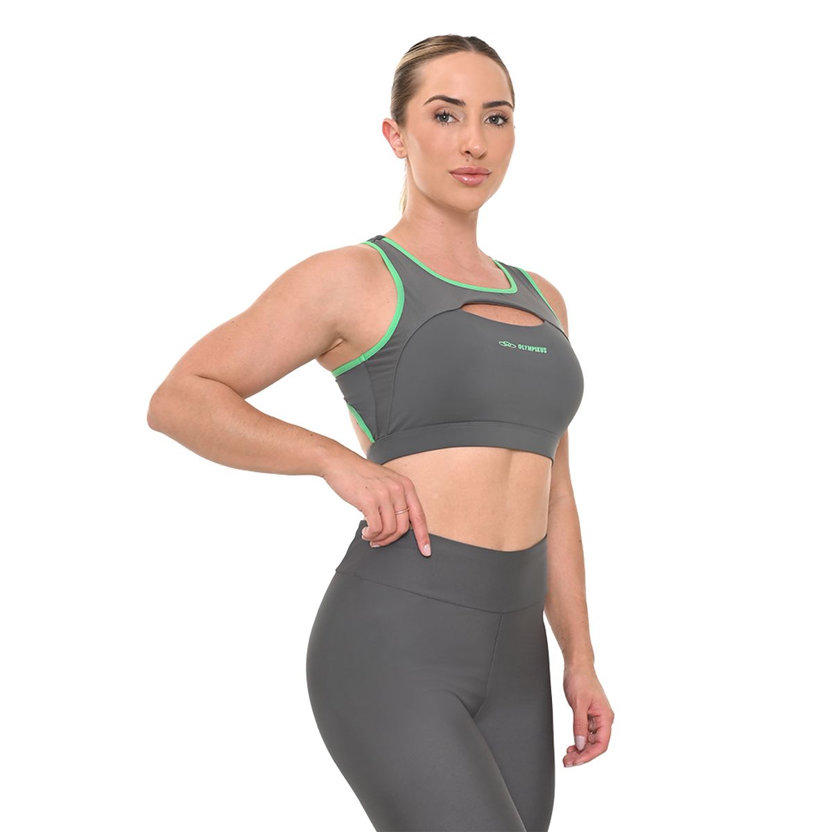 O Top de alto impacto é produzido em tecido de co... Maismpressão em poliamida e elastano, proporcionando alta sustentação com uma sensação de frescor. Seus recortes em tela dupla de poliamida mantém o seu corpo seco e confortável. Já o design das costas proporciona liberdade de movimentos e o tecido do forro em poliamida dá uma sensação de conforto. Também possui regulagem na cintura, permitindo que a peça seja ajustada ao corpo, proporcionando maior firmeza e estabilidade com um caimento firme. Todas as costuras são embutidas para não gerar atrito ao corpo. Possui ainda logo em silk silicone prata. Menos