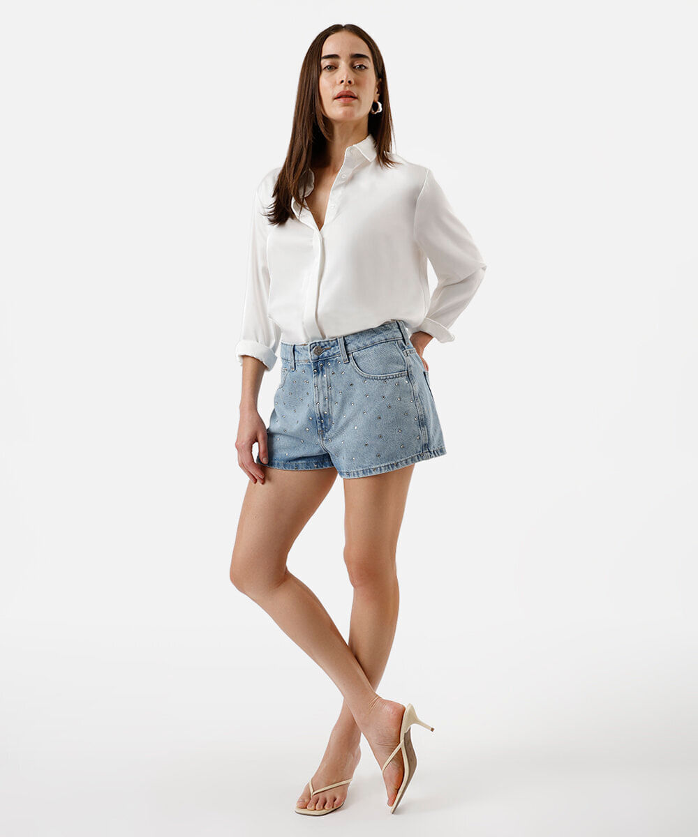 short curto feminino jeans com brilhos azul