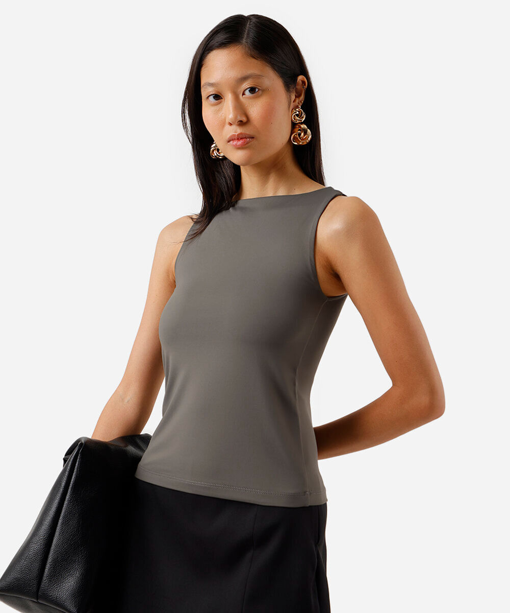 regata feminina de poliamida decote canoa cinza