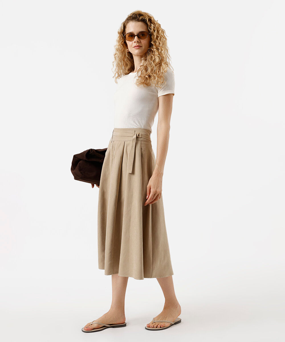 saia midi godê feminina com pregas e cinto bege
