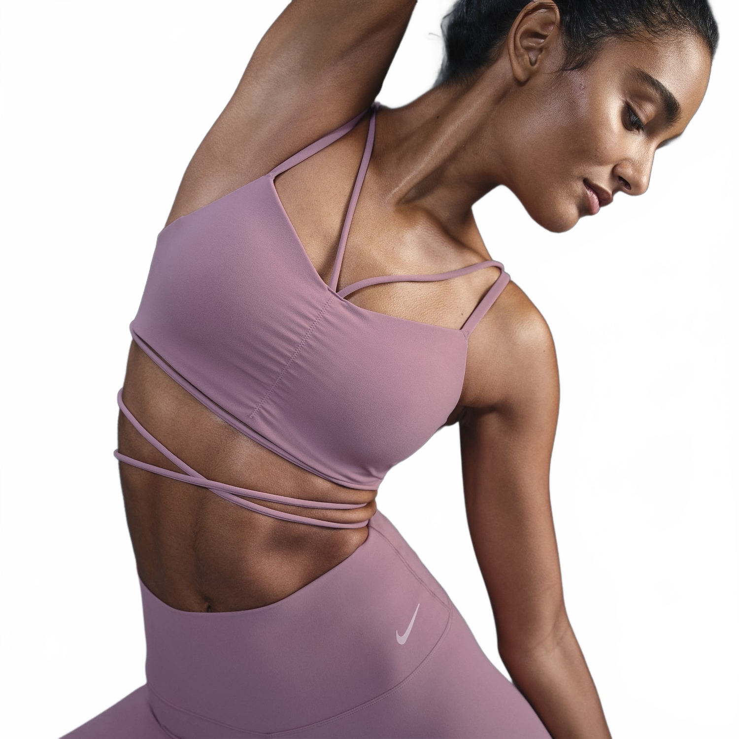 © feito com tecido InfinaSoft leve e tem uma fixação suave que permite que você se mova livremente. Os bojos costurados oferecem cobertura confiável, enquanto uma alça removÃvel que envolve a cintura oferece opções.  BenefÃcios Tecnologia Nike Dri-FIT absorve o suor da sua pele para evaporação mais rápida, ajudando a manter você seco e confortável. Suporte leve oferece uma pegada suave com muita liberdade. O bojo costurado em uma só peça oferece cobertura que permanece no lugar.  Detalhes do Produto Alça removÃvel na cintura Corpo: 63% nylon/37% spandex. Mesh: 82% poliéster/18% spandex. Tecido traseiro do bojo: 100% poliéster. Bojo: 100% poliuretano. Lavável à máquina Importado
