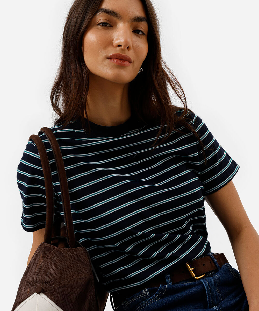 camiseta feminina com algodão listrada azul