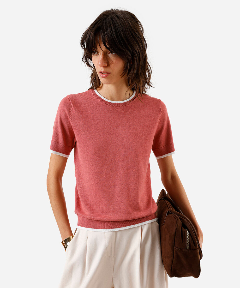 blusa manga curta regular friso contrastante rosa