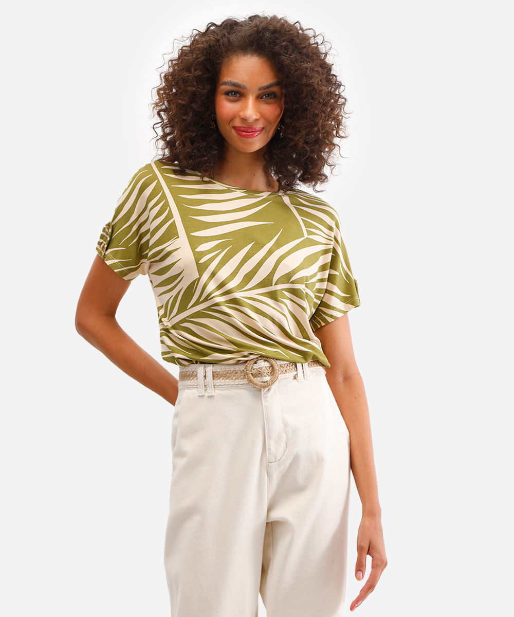 blusa feminina de viscose manga curta folhagens verde