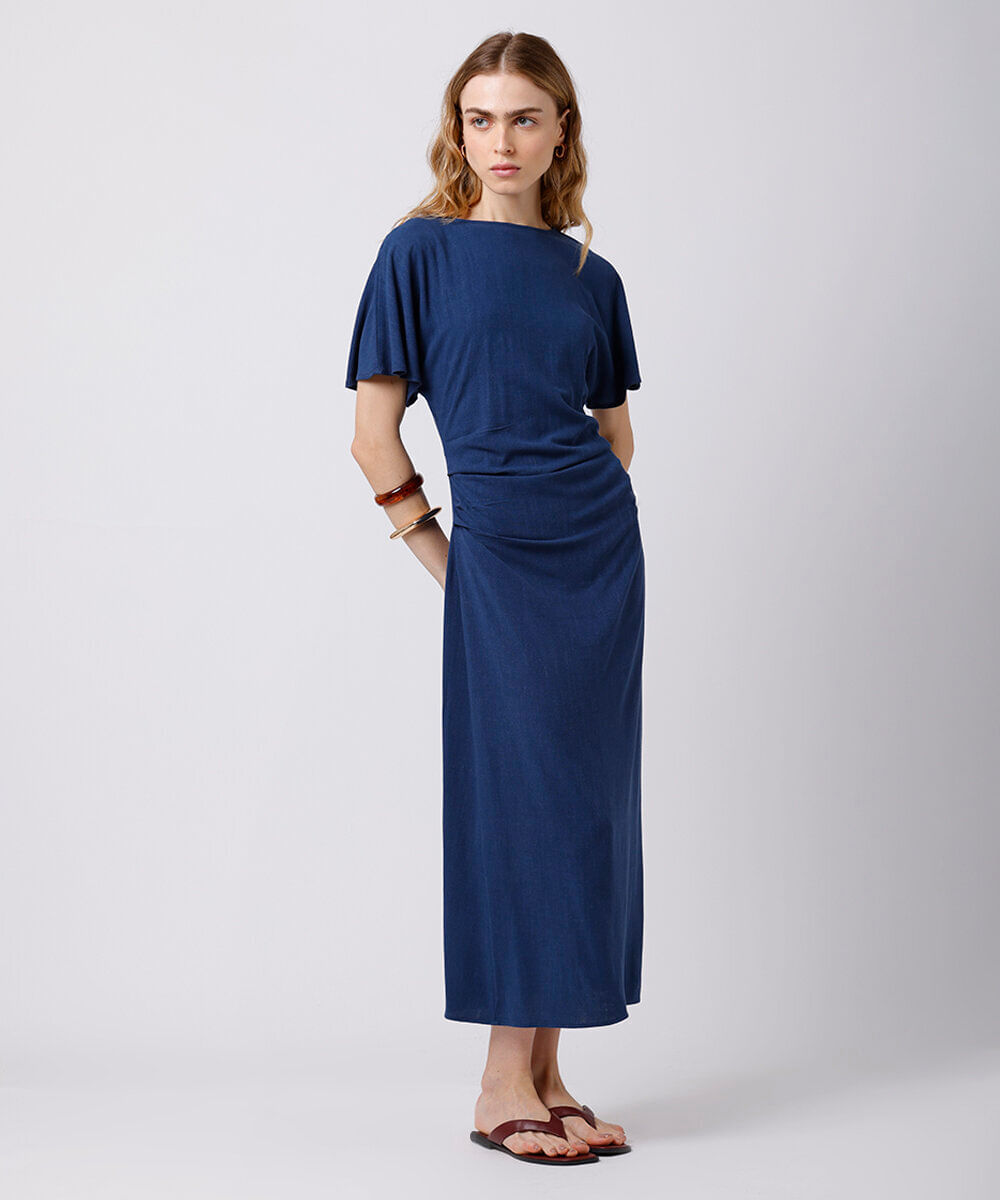 vestido midi feminino com linho e pregas mindset azul