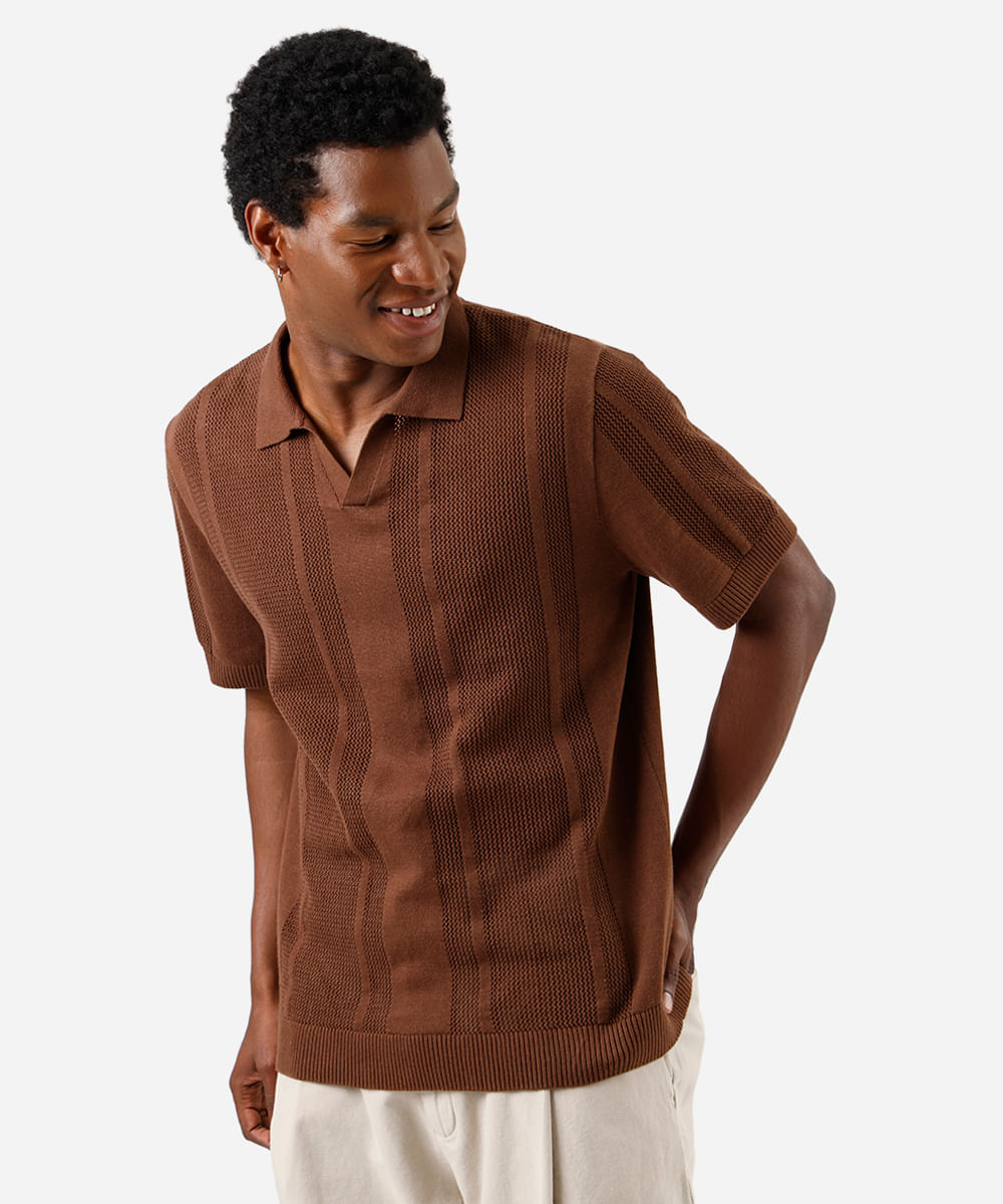 polo masculina de tricot manga curta texturizada marrom