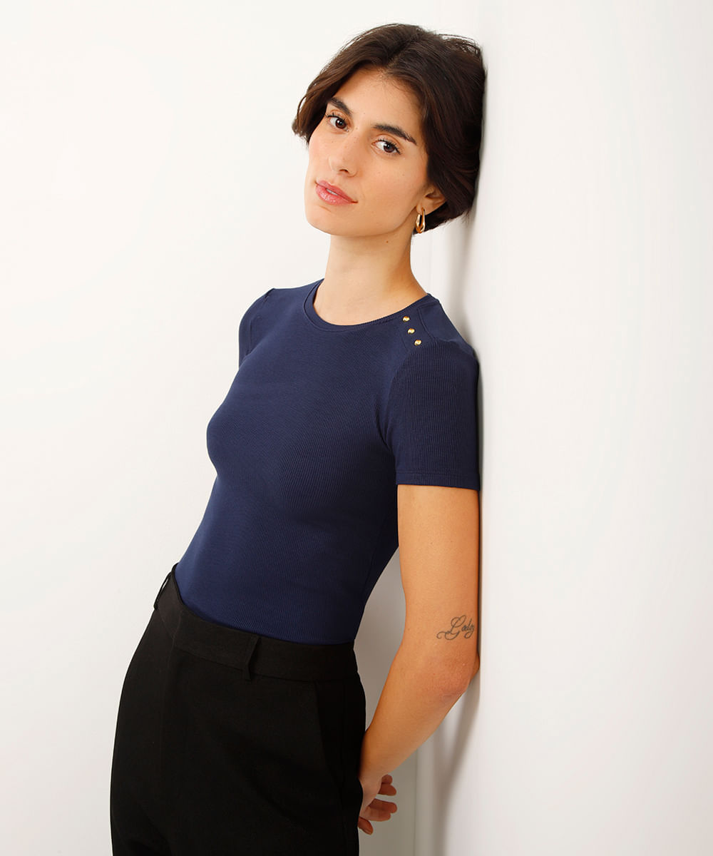 blusa de viscose canelada com tachas azul