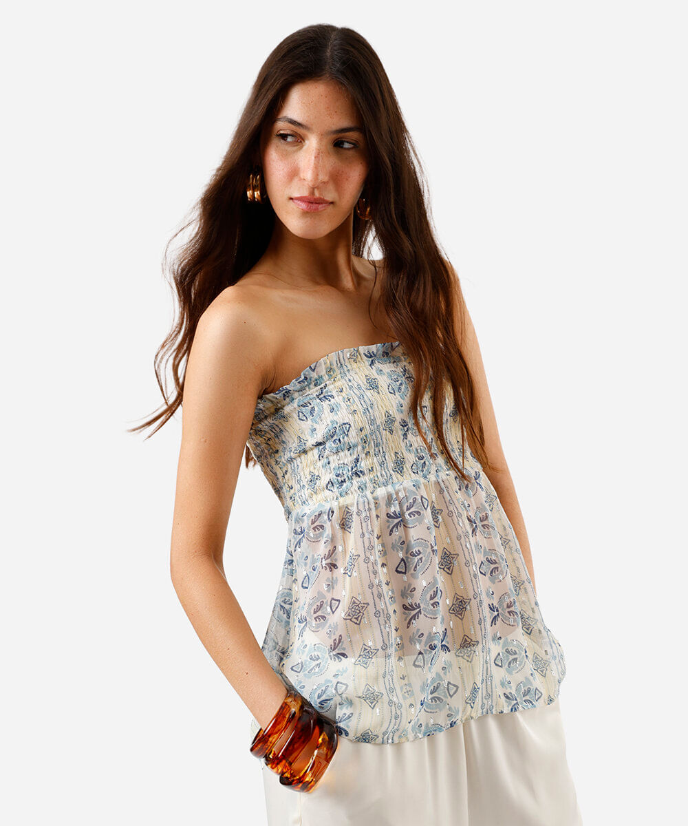 blusa sem alça feminina franzida estampada bege