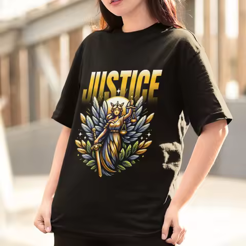 Camiseta Feminina GuGi Algodão Estampa Justice Deusa Justiça Espada Balança Casual Estilosa Fashion