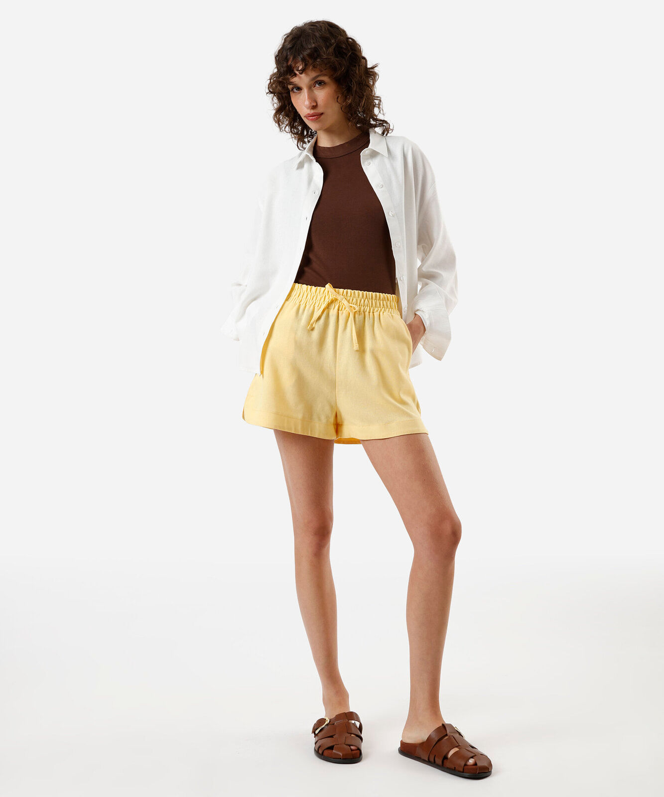 short feminino com linho cós elástico amarelo