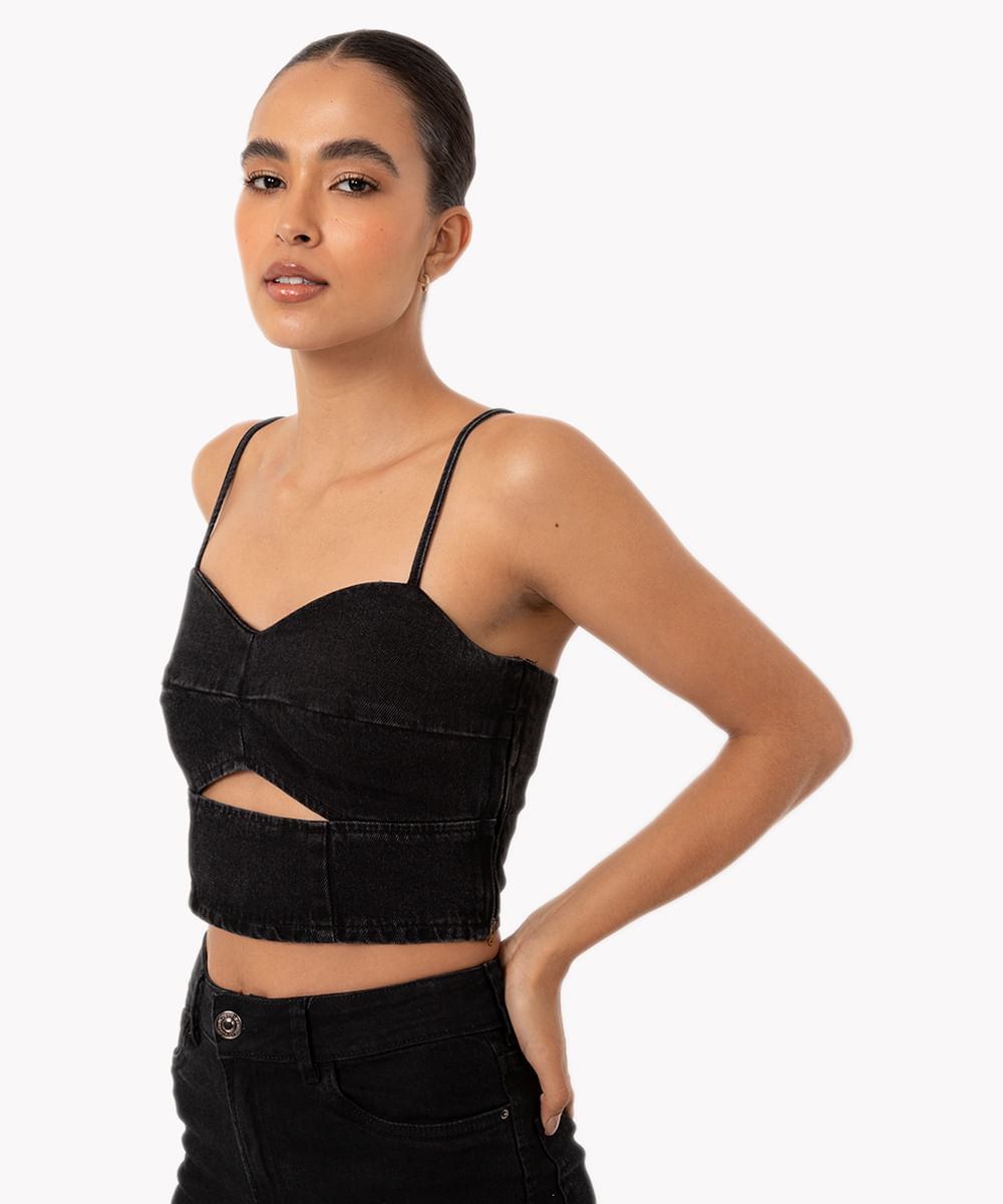cropped jeans cut out alça fina preto