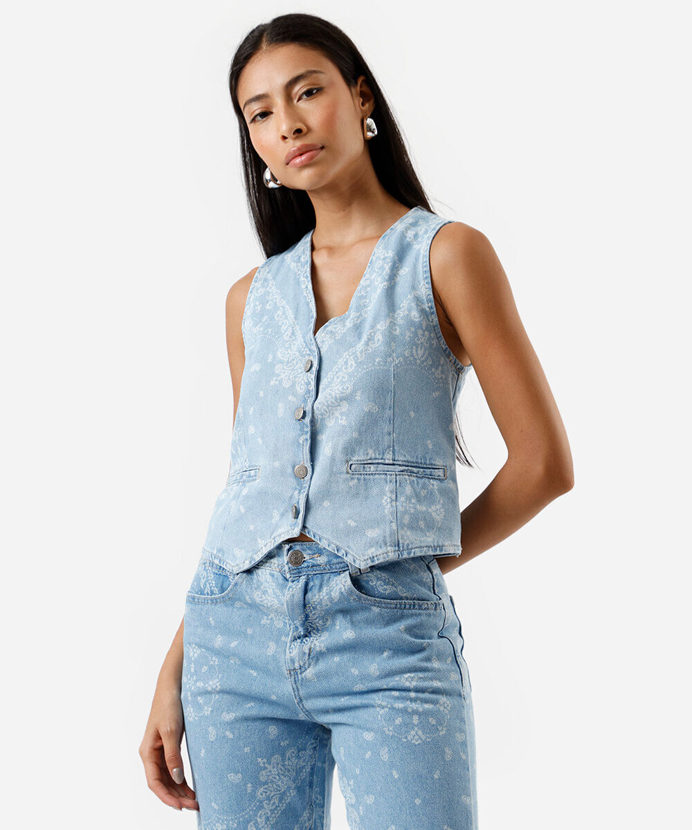 colete feminino jeans paisley azul