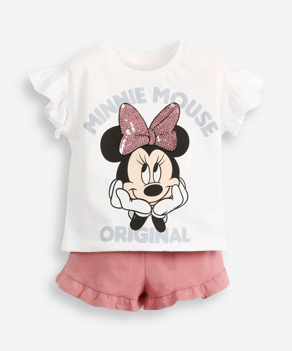 conjunto infantil curto minnie com paetê off white