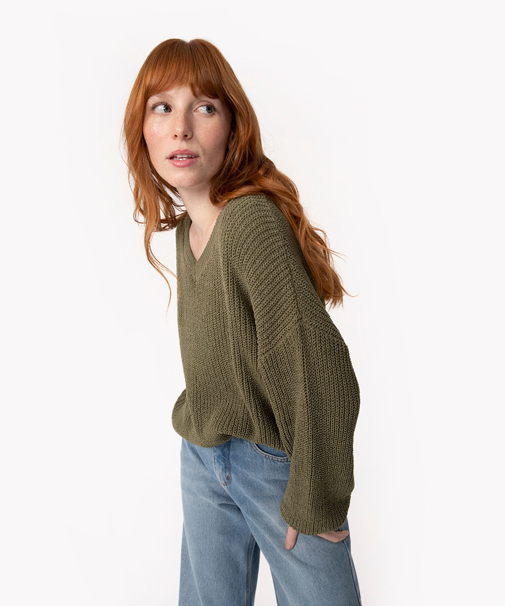 suéter de tricô gola v manga longa verde