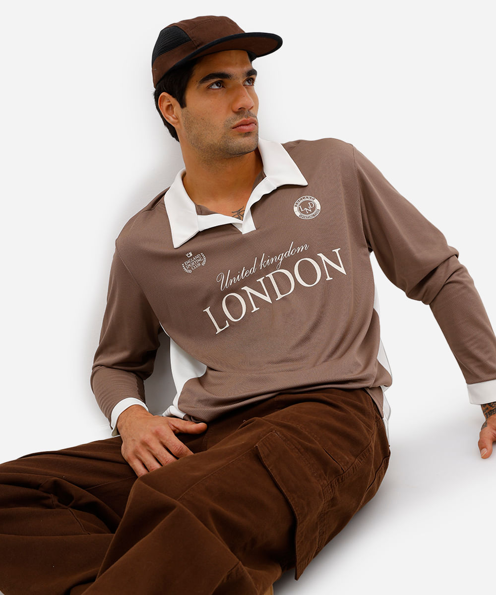 camiseta retrô unissex com gola manga longa london bege