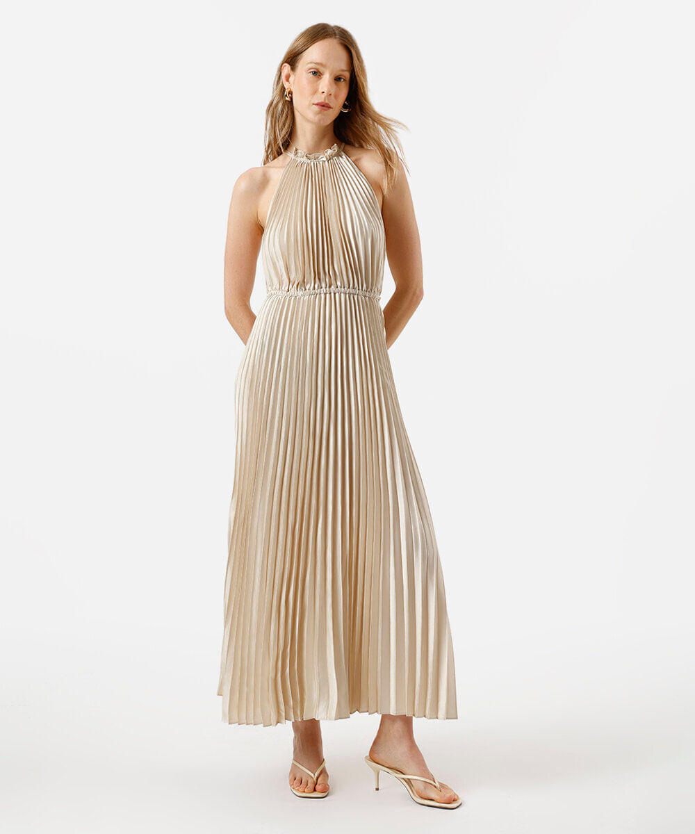 vestido longo feminino halterneck plissado acetinado bege