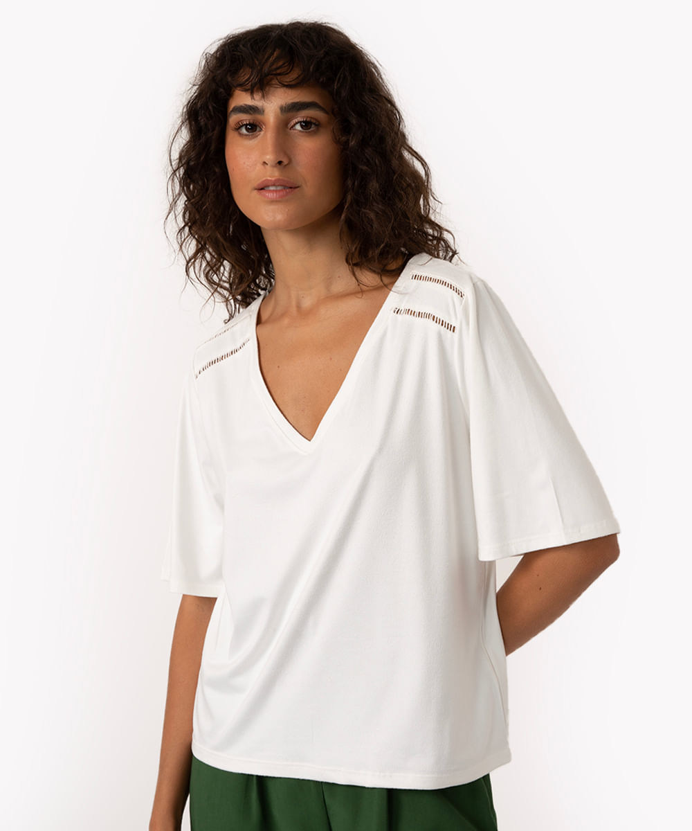 blusa de suede decote v manga curta off white