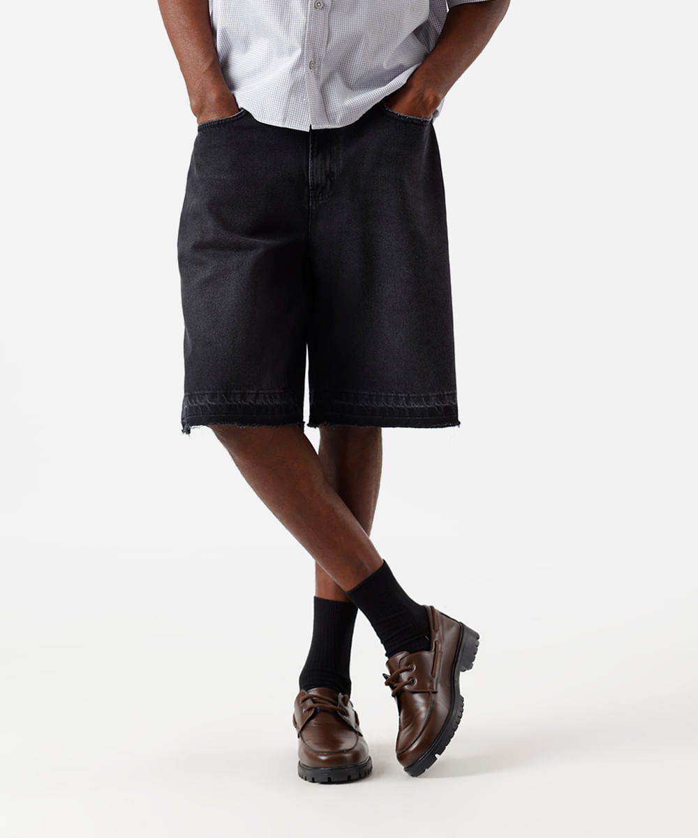 bermuda baggy masculina jeans com barra desfeita preta