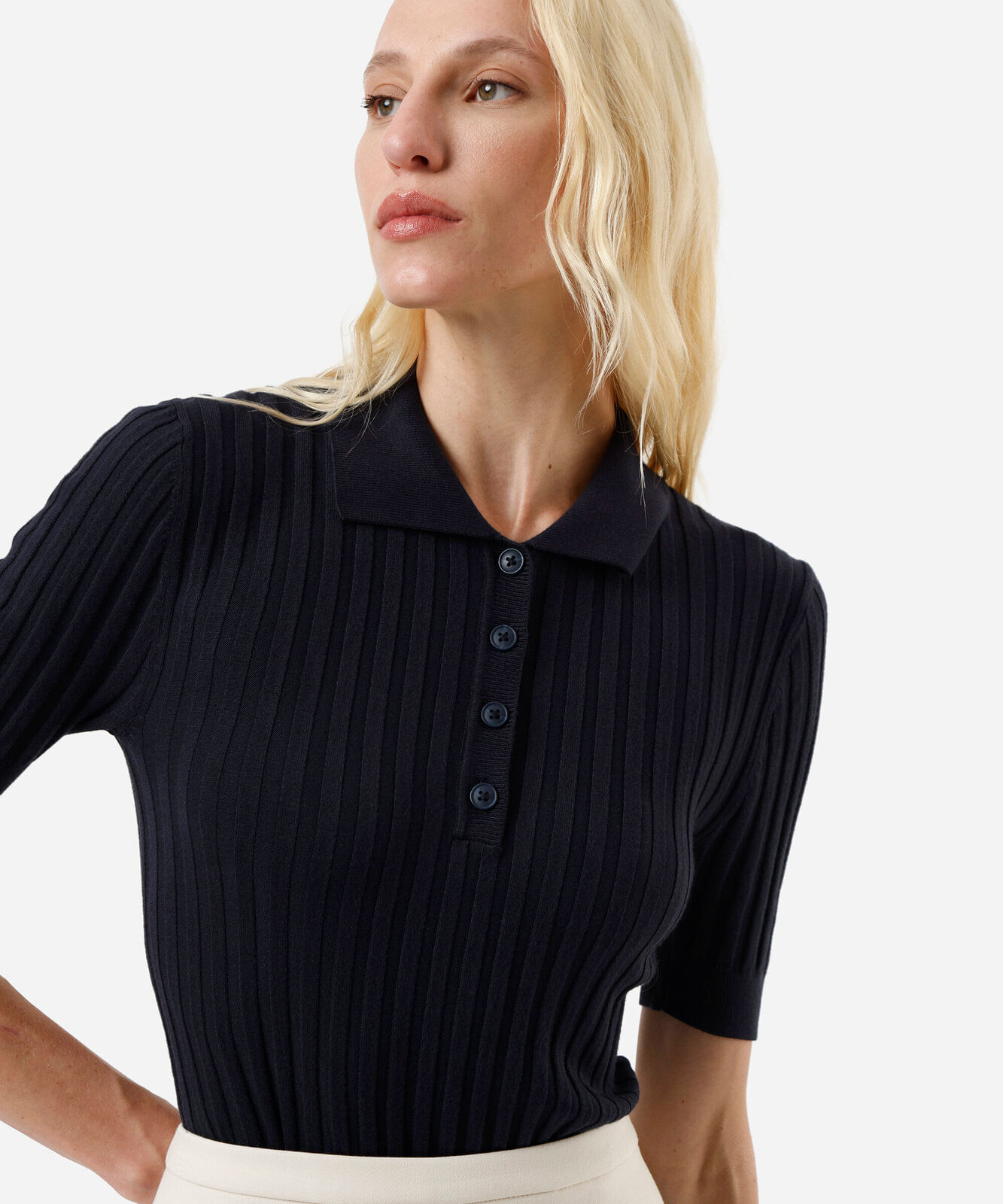 polo feminina de tricot canelada azul