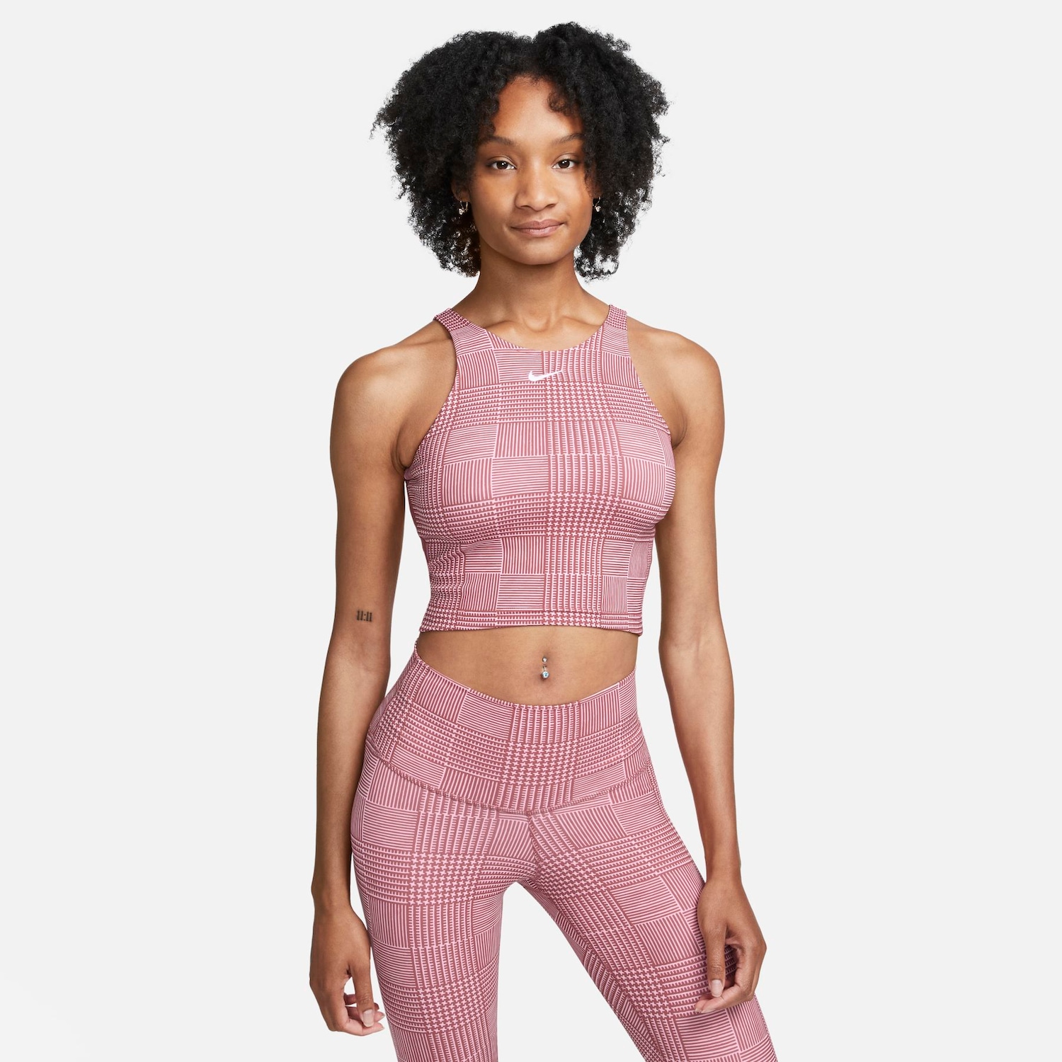 Esteja você começando a manhã ou relaxando à n... Maisoite, esta regata elástica reversível da frente para trás oferece opções. Mostre o lado sólido na frente ou use o xadrez completo - de qualquer forma, você obtém um ajuste confortável e seguro com tecnologia que absorve o suor, para que você esteja livre para posar ou relaxar como quiser.BenefíciosTecnologia Nike Dri-FIT absorve o suor da sua pele para evaporação mais rápida, ajudando a manter você seco e confortável.O design reversível oferece opções de estilo.Detalhes do Produto80% poliéster e 20% elastanoComprimento croppedLavável à máquinaImportado Menos