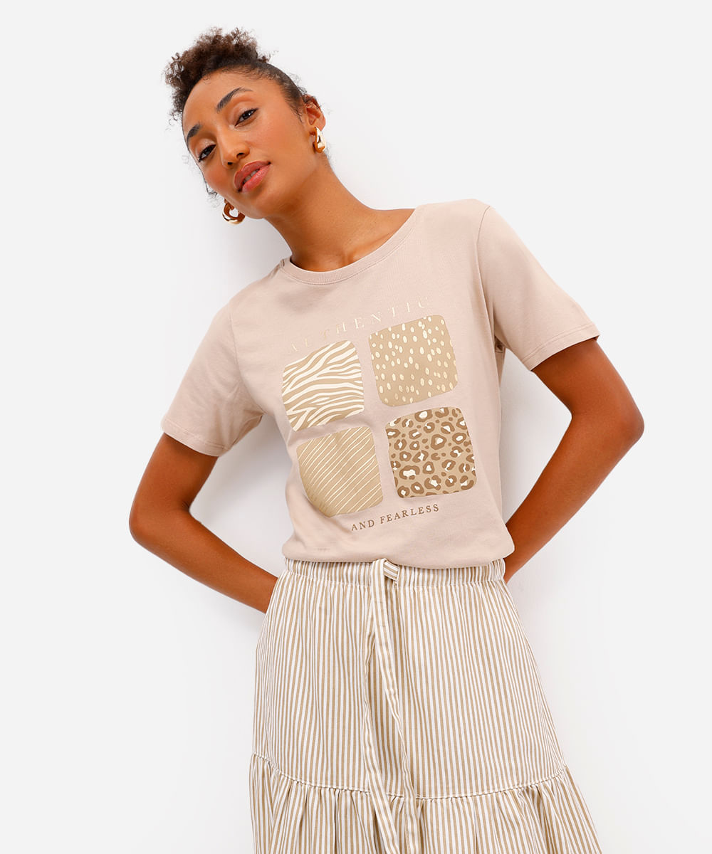 camiseta feminina de algodão animal print bege