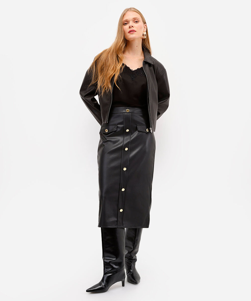 saia midi feminina de poliuretano com botões preta
