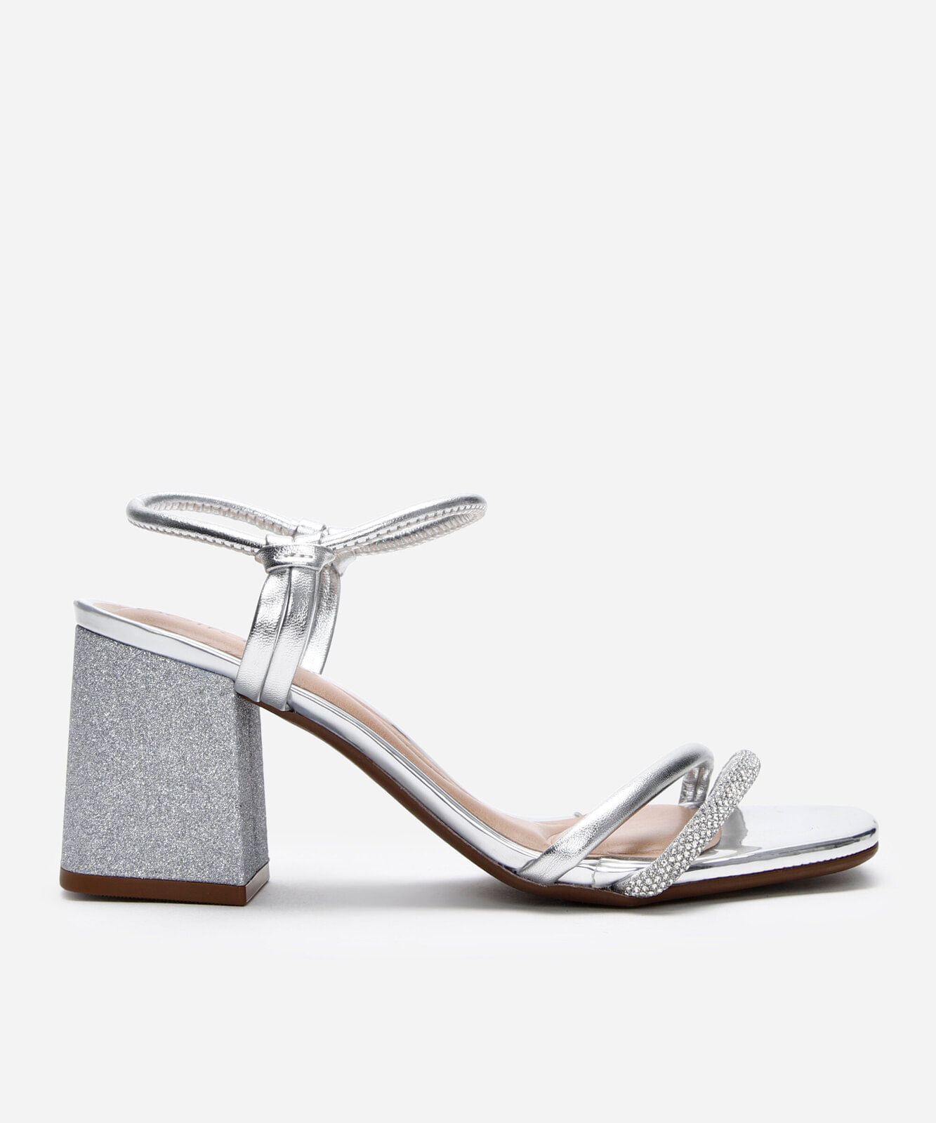 sandália salto grosso com brilhos beira rio prateada