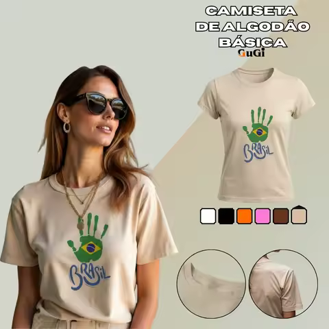 Camiseta Feminina 100% Algodão 30.1 T-Shirt Casual Brasil Estampa Mão Bandeira Baby Look Confortável