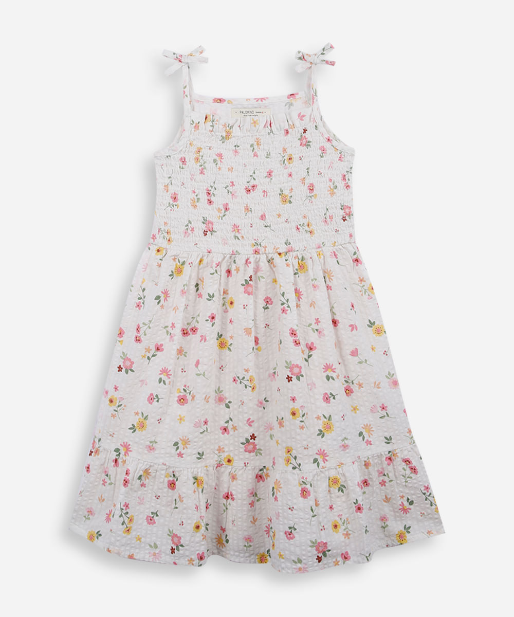 vestido infantil de algodão franzido floral off white