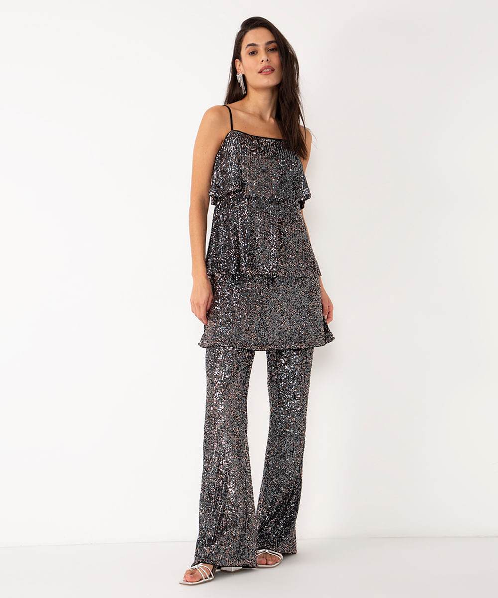 calça flare de paetê cintura alta colorido