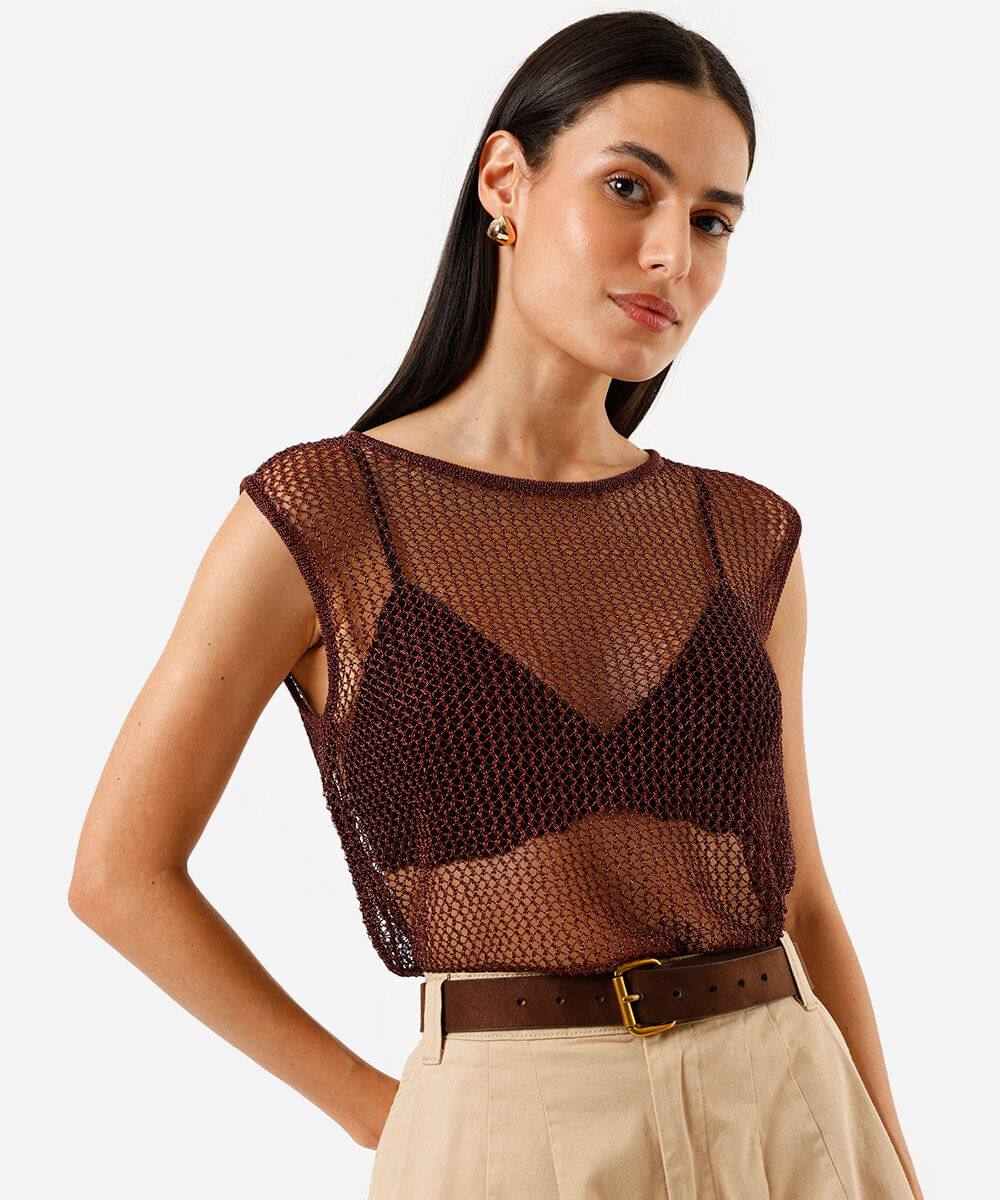 Regata de tricot feminina metalizada marrom
