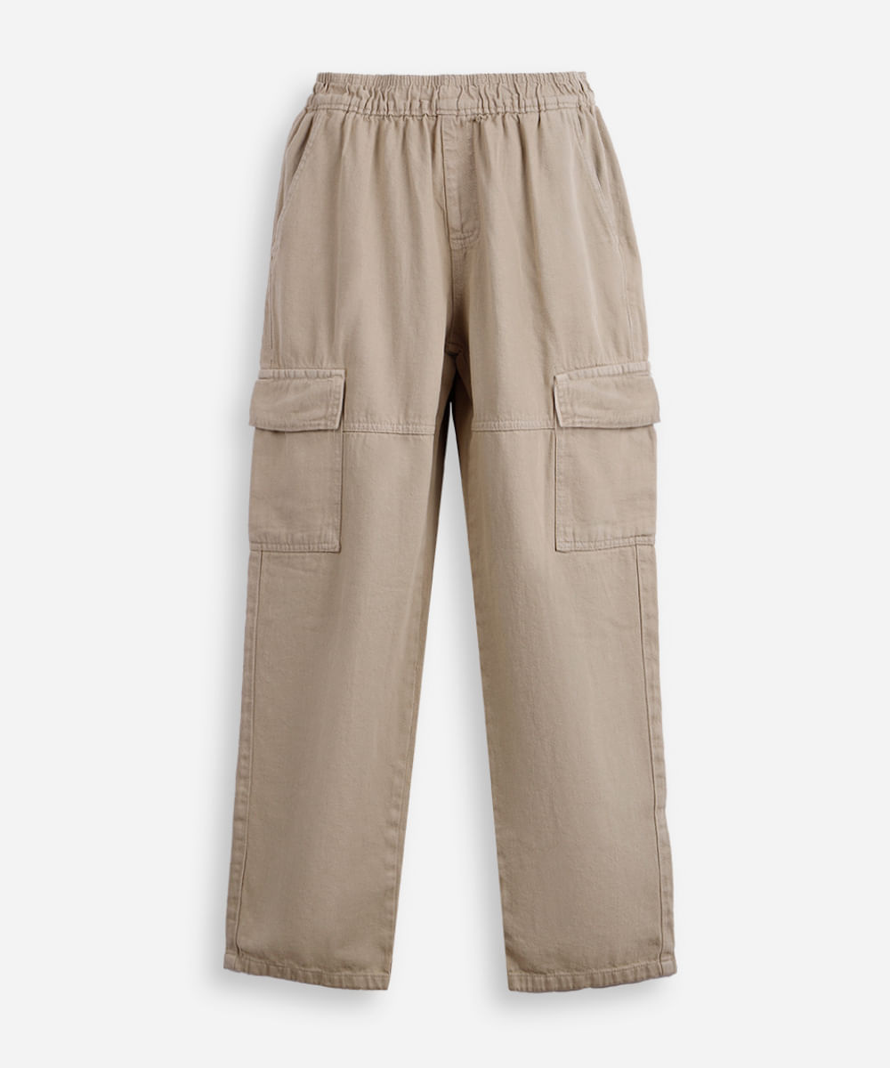 calça cargo reta juvenil de sarja cós elástico bege