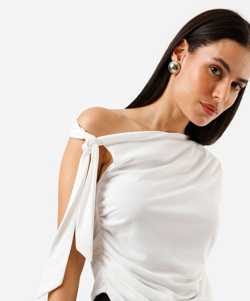 blusa acetinada decote reto sem alça com pala off white