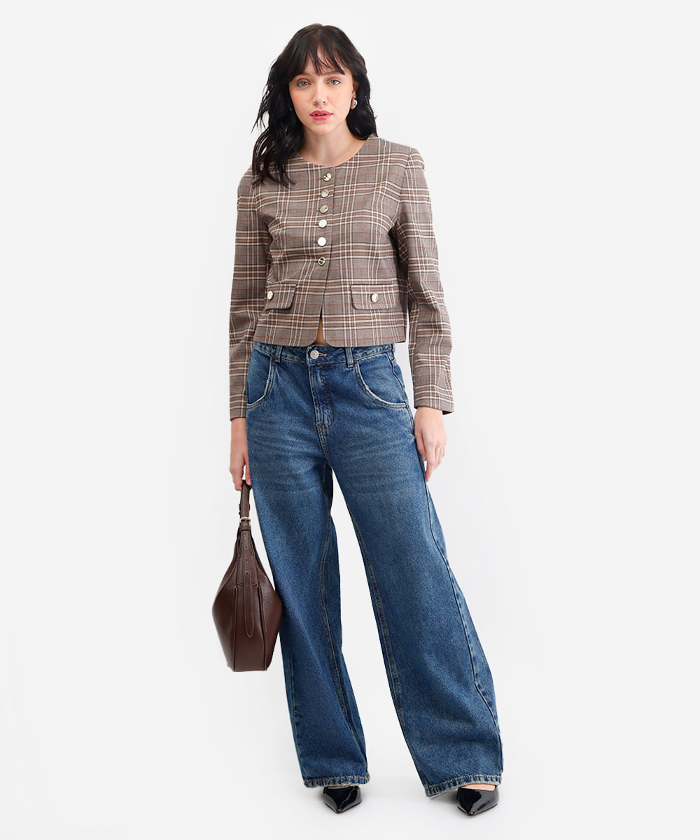 casaco feminino decote redondo xadrez marrom