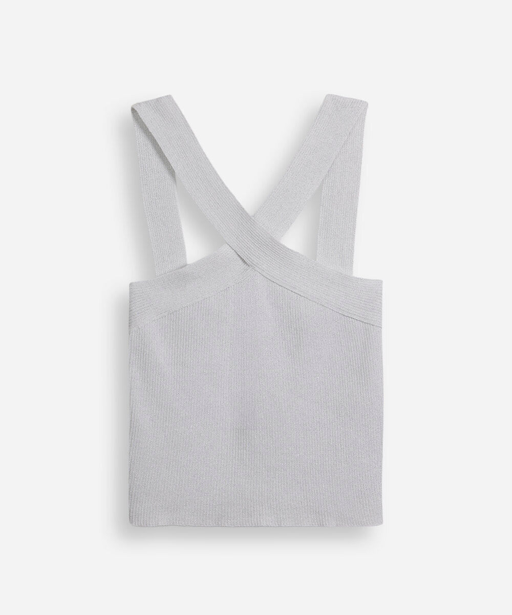 cropped halter neck juvenil de tricô com lurex prateado