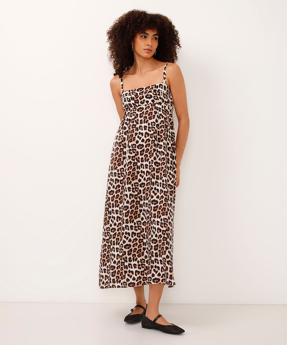 vestido midi de viscose alça fina animal print bege