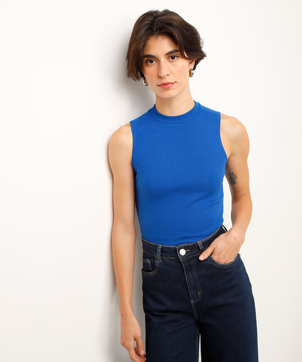 regata canelada básica gola alta azul
