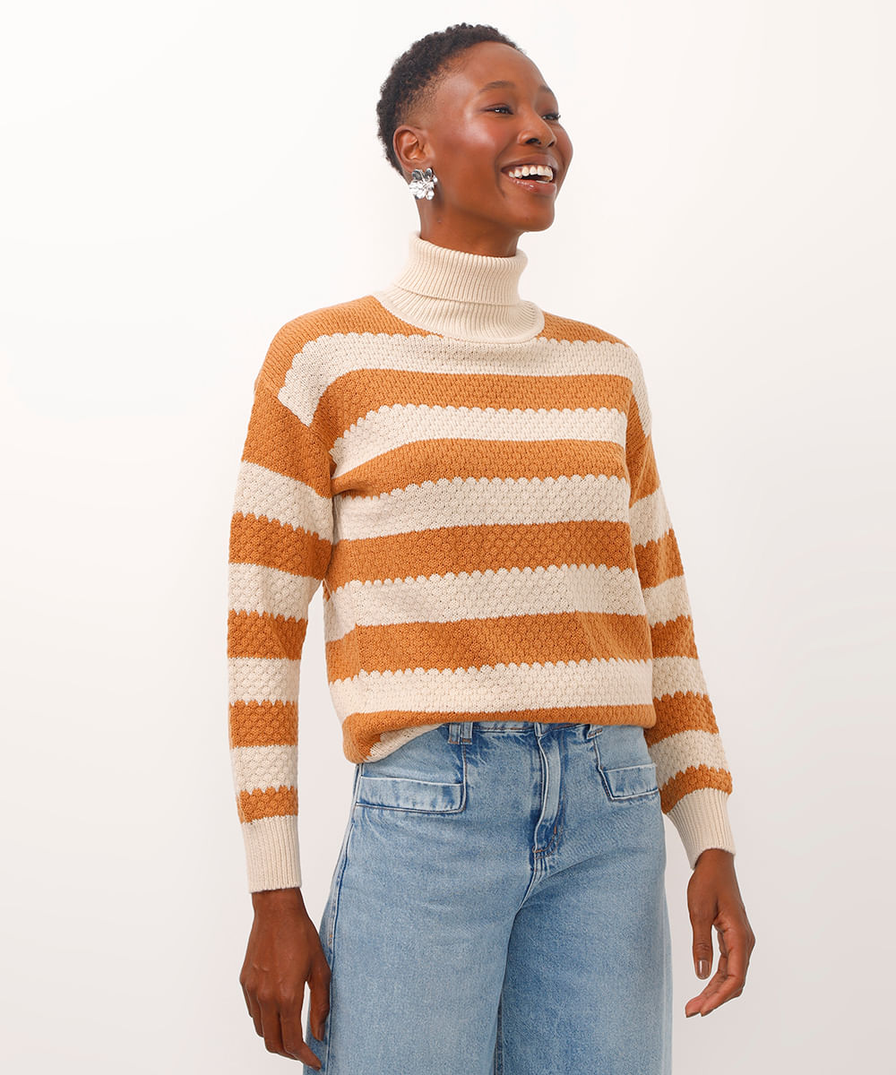 suéter de tricot gola alta listrado bege