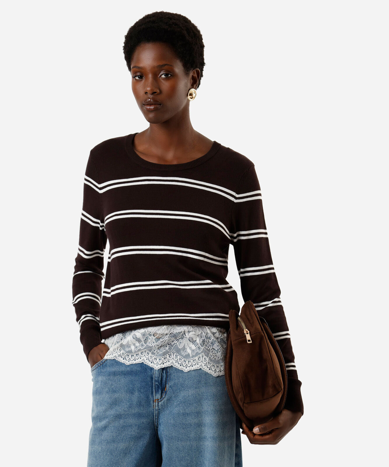 suéter feminino gola careca listrado marrom