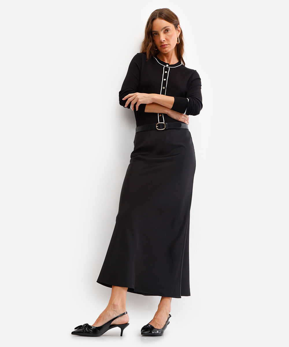 saia longa feminina evasê acetinada cós elástico preta