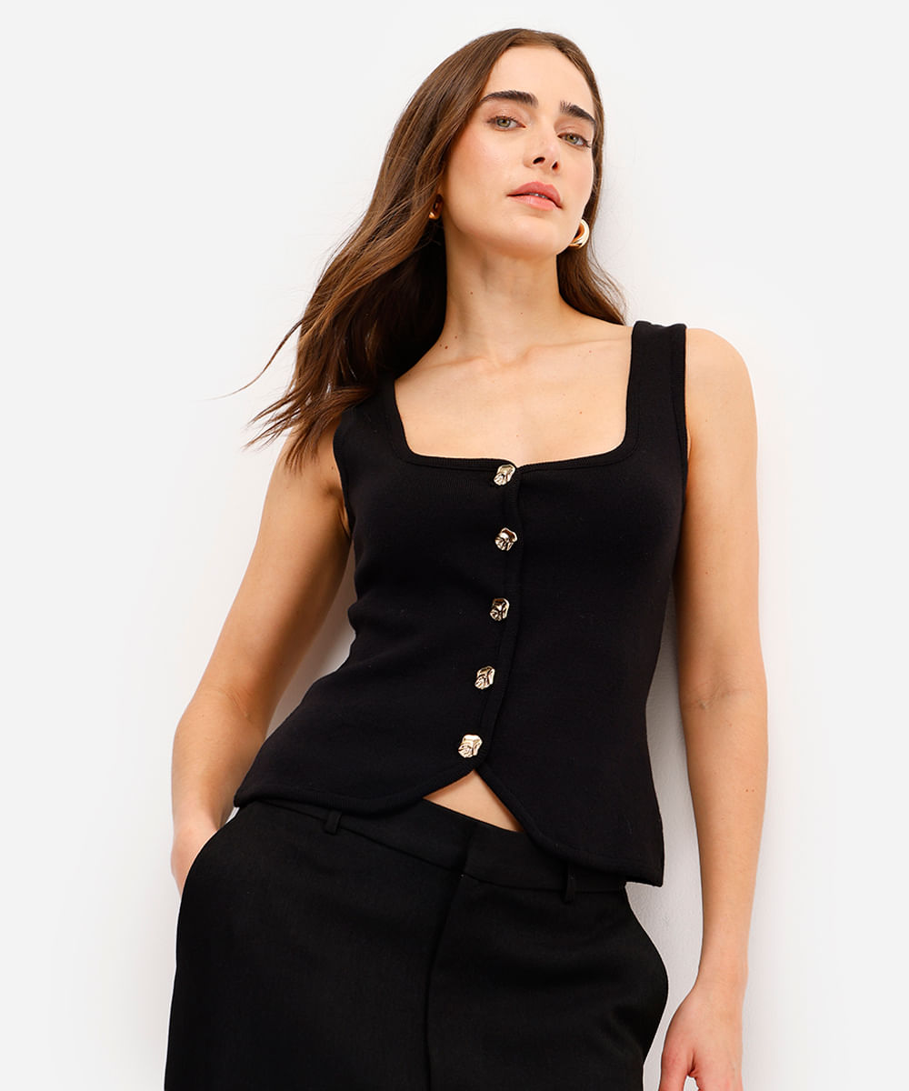 regata feminina de tricot com botões preta