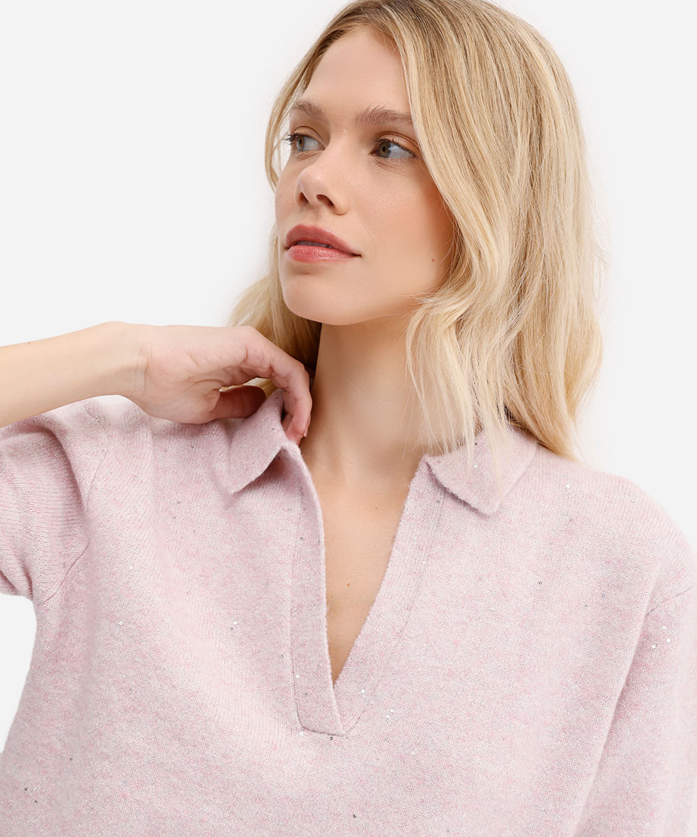 polo feminina de tricot com paetê e lurex rosa